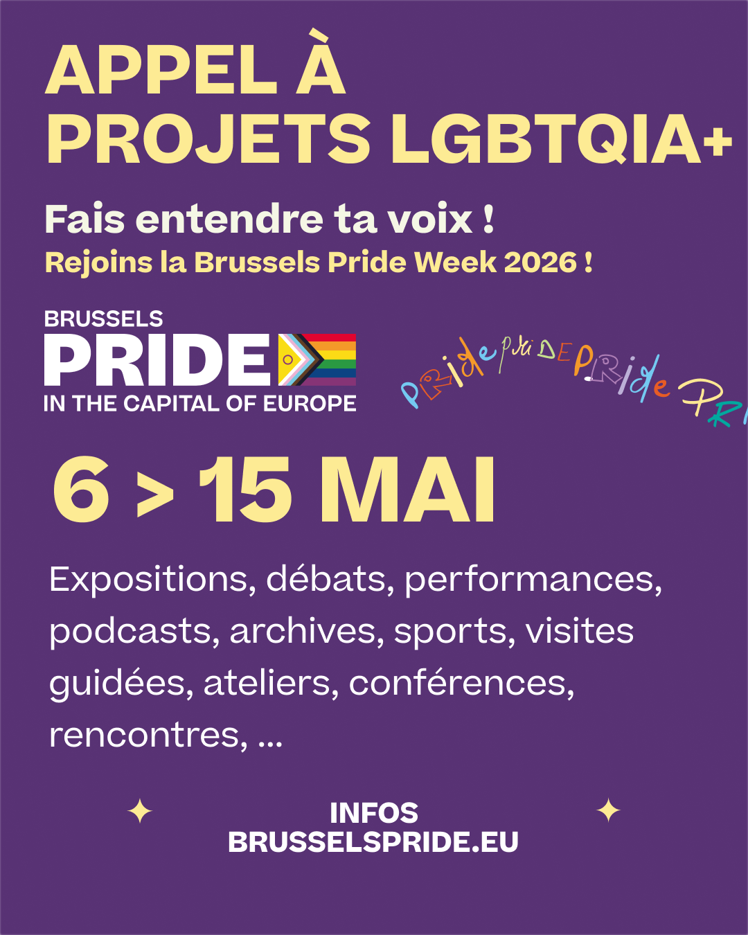 Dans le cadre de la Brussels Pride Week 2026 (du 6 au 15 mai), nous lançons un appel à projets ouvert aux associations, collectifs, artistes et militant·es souhaitant contribuer à une édition exceptionnelle célébrant 30 ans de Pride à Bruxelles.