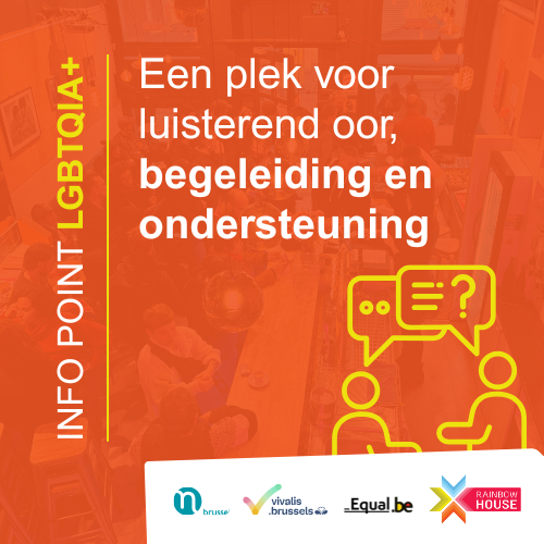 Elke zaterdag van 14u tot 18u, staat een team van opgeleide vrijwilligers klaar om je te ontvangen in een warme, veilige en vertrouwelijke omgeving. Heb je nood aan ondersteuning, informatie of een doorverwijzing naar geschikte organisaties (mentale en seksuele gezondheid, trans- en genderidentiteit, jongeren, discriminatie, regenboog families, gemeenschapsleven, cultuur, enz.)? Het LGBTQIA+ Info Point is er voor jou.